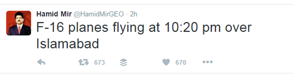 হামিদ মিরের যে টুইট নিয়ে এত হইচই, তাতে তিনি লেখেন, ‘‘রাত ১০টা ২০ মিনিট থেকে ইসলামাবাদের আকাশে এফ-১৬ উড়তে শুরু করেছে।’’ যুদ্ধের আতঙ্কে ইসলামাবাদের কোনও কোনও এলাকায় সাধারণ মানুষকে রাস্তায় বেরিয়ে পড়েন বলেও শোনা যায়। ফলে স্বাভাবিক ভাবেই নানা মহলে চাঞ্চল্য ছড়ায়। কারণ ভারত-পাক টানটান উত্তেজনার মাঝে রাতে পাকিস্তানের রাজধানীর আকাশে যুদ্ধবিমান উড়তে শুরু করলে তা যে অশনি সঙ্কেতই বয়ে আনে,তা নিয়ে কারও সংশয় নেই। আতঙ্ক যাতে না ছড়ায়, তার জন্য ওই পাক সাংবাদিক পরে অবশ্য নিজেই সচেষ্ট হন। তিনি রাত ১২টা নাগাদ ফের টুইট করে জানান, আতঙ্কিত হওয়ার কিছু নেই। দেশকে রক্ষা করতে পাক বাহিনী যে সব সময় প্রস্তুত, সে কথাই বুঝিয়ে দিচ্ছে বিমান বাহিনী।