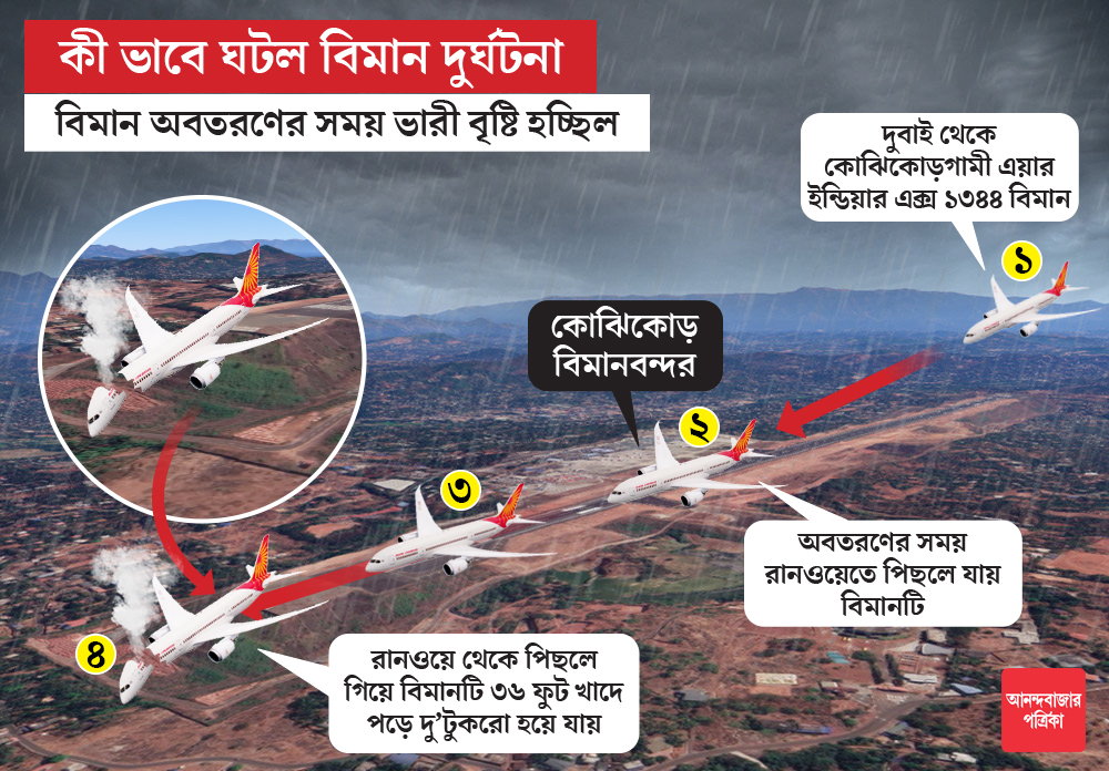 এ দিন রাতে কারুপুর বিমানবন্দরে নামার সময় বিমানটির দুর্ঘটনার কবলে পড়ে। প্রাথমিক ভাবে জানা গিয়েছে, অত্যন্ত ভারী বৃষ্টির মাঝে বিমানটি অবতরণের চেষ্টা করছিল। সে সময়ই বিমানের চাকা পিছলে গিয়ে দুর্ঘটনা ঘটে। কেন্দ্রীয় অসামরিক বিমান পরিবহণ মন্ত্রী হরদীপ সিংহ পুরী টুইটারে জানিয়েছেন, রানওয়ে থেকে পিছলে গিয়ে বিমানটি ৩৬ ফুট খাদে পড়ে দু’টুকরো হয়ে যায়।