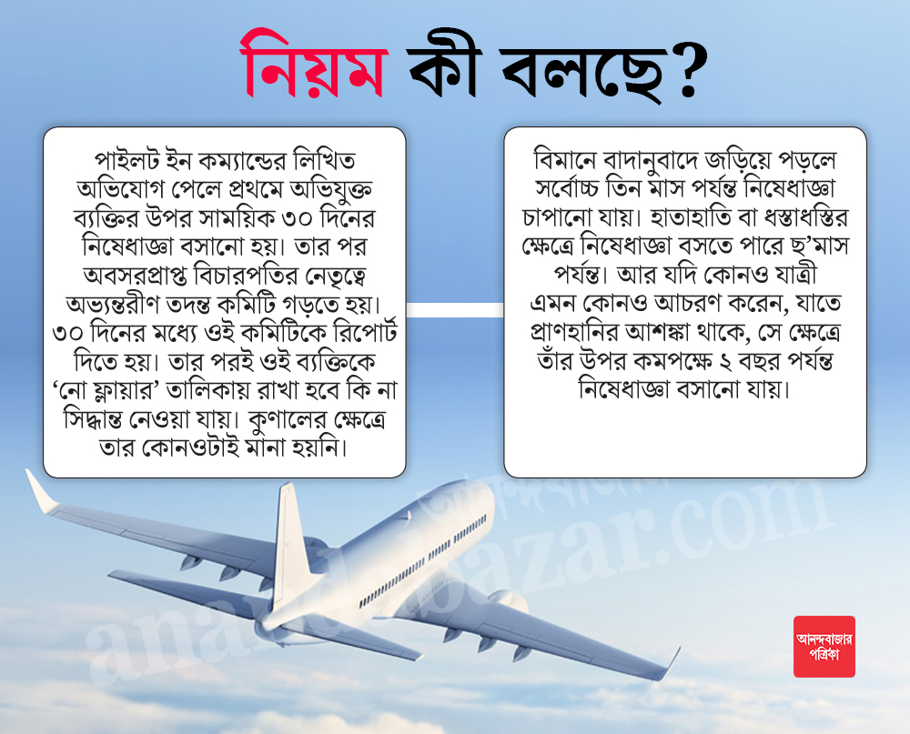 মঙ্গলবার মুম্বই থেকে পুণে আসার পথে ইন্ডিগোর ৬ই৫১৭ বিমানে সাংবাদিক অর্ণব গোস্বামীর দিকে বেশ কিছু ‘অপ্রিয়’ প্রশ্ন ছুড়ে দেন কুণাল। পরে নিজে সেই ভিডিয়ো সোশ্যাল মিডিয়াতেও আপলোড করেন তিনি। তার পরেই একের পর এক নিষেধাজ্ঞার খাঁড়া নেমে আসে কুণালের উপর। প্রথমে ইন্ডিগো-র তরফে ছ’মাসের জন্য তাঁকে নিষিদ্ধ করা হয়। পরে গো এয়ার, স্পাইসজেটের ‘নো ফ্লায়ার’ তালিকাতেও ঠাঁই হয় কুণালের।