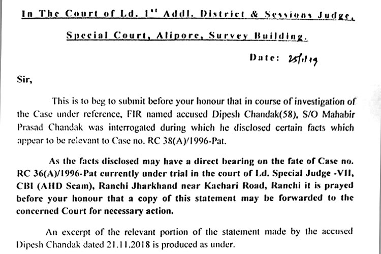 কলকাতা পুলিশের নথি বলছে, চন্দক জেরায় জানান, ২০১৮-র মে’তে রাঁচীর সিবিআইয়ের বিশেষ আদালত আরসি-৩৮(এ)/ ৯৬ মামলায় তাঁর এবং সিবিআই অফিসার এ কে ঝায়ের সাক্ষ্যগ্রহণ করতে অস্বীকার করে। উল্টে তাঁদের অভিযুক্ত হিসেবে নথিভুক্ত করে। পরে উচ্চ আদালত সে ক্ষেত্রে স্থগিতাদেশ দেয় বলে জানিয়েছেন দীপেশ।