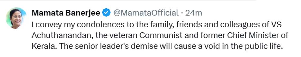 মুখ্যমন্ত্রী থাকাকালীন শবরীমালা পদব্রজে গিয়ে তীর্থক্ষেত্র দর্শন করে বিতর্কও তৈরি করেছিলেন তিনি। ২০২১ সালে বিধানসভা ভোটের আগে সিপিএমের তৎকালীন সাধারণ সম্পাদক সীতারাম ইয়েচুরিকে চিঠি লিখে রাজনীতি থেকে অব্যাহতি চেয়েছিলেন দলের কেন্দ্রীয় কমিটির আমন্ত্রিত সদস্য অচ্যুতানন্দন। সোমবার অচ্যুতানন্দনের মৃত্য়ুতে শোক প্রকাশ করে মুখ্যমন্ত্রী মমতা বন্দ্য়োপাধ্যায় সমাজমাধ্যমে লিখেছেন, ‘‘কেরালার প্রাক্তন মুখ্যমন্ত্রী এবং প্রবীণ কমিউনিস্ট নেতা ভিএস অচ্যুতানন্দনের পরিবার, বন্ধু এবং সহকর্মীদের প্রতি আমি সমবেদনা জানাই। প্রবীণ নেতার মৃত্যু জনজীবনে শূন্যতা তৈরি করবে।’’