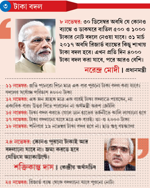 ১৪ নভেম্বর: তিন মাসের বেশি পুরনো কারেন্ট অ্যাকাউন্ট থেকে সপ্তাহে ৫০,০০০ টাকা তোলা যাবে। এটিএম থেকে টাকা তোলার চার্জ ৩০ ডিসেম্বর অবধি মকুব