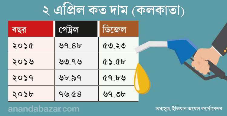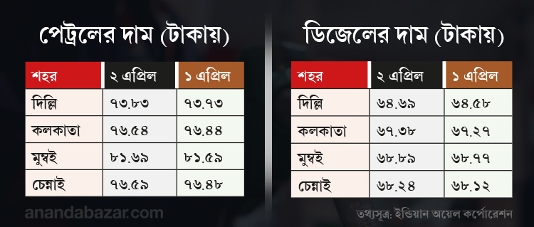 এ যেন নিজের রেকর্ড নিজেই ভাঙার মতো ঘটনা। রবিবারই দামের নিরিখে গত চার বছরের মধ্যে রেকর্ড গড়েছিল পেট্রল। ডিজেল গড়েছিল সর্বকালীন রেকর্ড। চব্বিশ ঘণ্টার মধ্যে দুই তেলের দাম আবার বাড়ল।