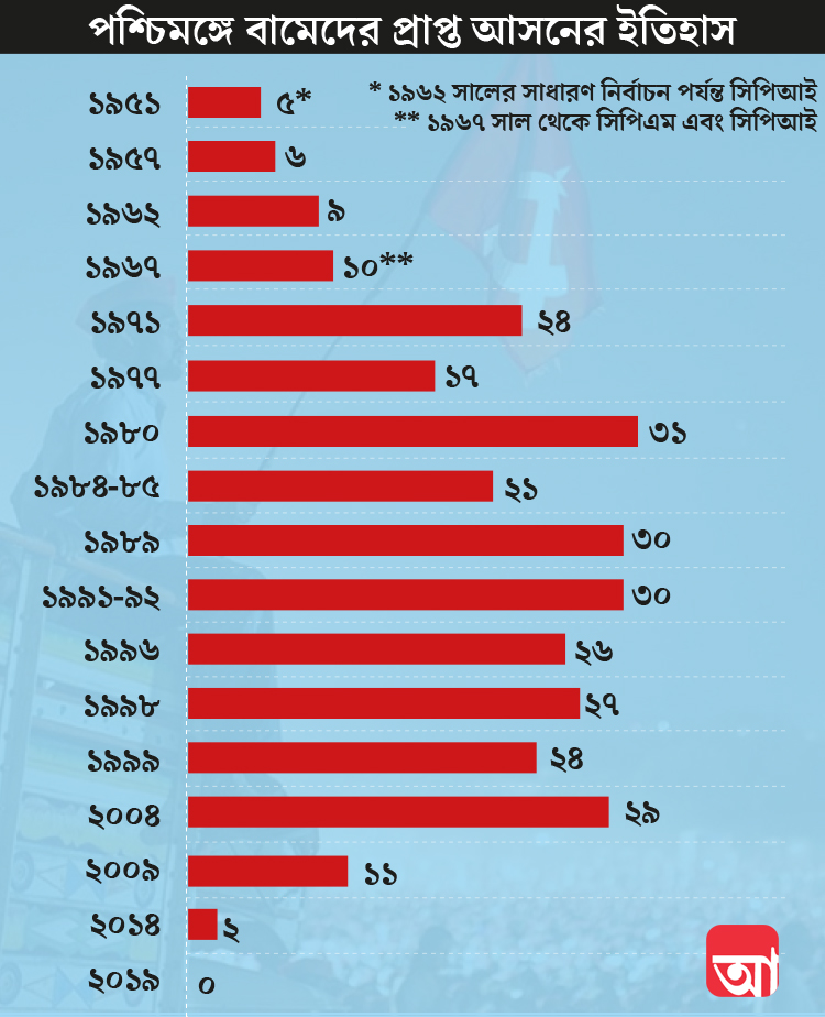 নির্বাচন কমিশনের বৃহস্পতিবার রাত পর্যন্ত হিসেব বলছে, লোকসভা ভোটে রাজ্যে এ বার বিজেপির ভোট বেড়ে হয়েছে ৪০.২৩%। আর বামেদের ভোট নেমে এসেছে ৭.৫২%-এ। তিন বছর আগের বিধানসভা ভোটে বামফ্রন্ট পেয়েছিল প্রায় ২৬% ভোট। বিজেপির ভোট তখন ছিল ১০.১৬%। অনেকেই মনে করছেন, বামেদের যে ১৫% ভোট ক্ষয় হয়েছে, তার সবটাই ঘরে তুলেছে বিজেপি! যে কারণে ভোটের আগে থেকে সামাজিক মাধ্যমে ঘুরতে থাকা স্লোগান এখন বাংলার রাজনৈতিক মানচিত্রে প্রতিষ্ঠিত তত্ত্ব— ‘বামের ভোট রামে’! বামের সঙ্গে তৃণমূল থেকে বেরোনো ভোট যোগ হয়ে বিজেপির পাল্লা ভারী হয়েছে বহু জায়গাতেই।