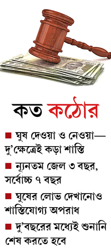 মন্ত্রিসভা যে দুর্নীতি দমন আইন সংশোধনী বিলে অনুমোদন দিয়েছে, তাতে যারা ঘুষ নিচ্ছে, তাদের পাশাপাশি যারা ঘুষ দেবে, তাদেরও শাস্তির বিধান করা হয়েছে। কোনও ব্যক্তি বা বাণিজ্যিক সংস্থা সরকারি আমলাকে ঘুষের লোভ দেখালে, তা-ও অপরাধের তালিকায় পড়বে। সরকারের যুক্তি, এতে ঘুষের জোগানে পাঁচিল তোলা যাবে। শুধু আর্থিক ঘুষ নয়, অন্য কোনও সুবিধা পাইয়ে দেওয়াও দুর্নীতির তালিকায় নিয়ে আসা হচ্ছে।