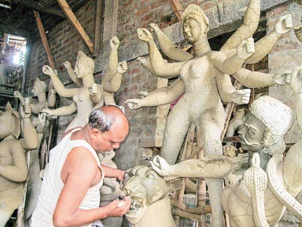মৃণ্ময়ী: প্রতিমার কাঠামোয় পড়েছে মাটির প্রলেপ। করিমগঞ্জের পটুয়াপাড়ায়। ছবি: উত্তম মুহরী।