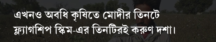 সন্দেহ গাঢ় হয় যখন নজরে পড়ে, এখনও অবধি কৃষিতে মোদীর তিনটে ফ্ল্যাগশিপ স্কিম-এর তিনটিরই করুণ দশা। ২০১৯ সালের মধ্যে প্রধানমন্ত্রী কৃষি সিঁচাই যোজনার অধীনে ৯৯টি বৃহৎ সেচ প্রকল্প সম্পূর্ণ হওয়ার কথা ছিল। এখনও অবধি হয়েছে মাত্র দশটা, তারও অনেকগুলোর খেত অবধি ক্যানাল টানার কাজ শেষ হয়নি।