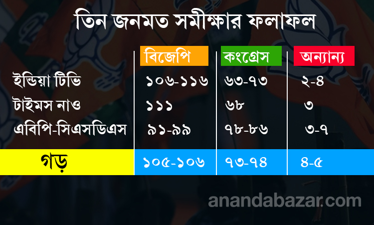 তিনটি জনমত সমীক্ষার গড় হিসেব বলছে, গুজরাতে এ বার বড়জোর ১০৫/১০৬টি আসন পাওয়ার সম্ভাবনা টানা ২২ বছরের শাসক দল বিজেপি’র। গড়ে কংগ্রেসের ঝুলিতে আসতে পারে ৭৩/৭৪টি আসন। অন্যরা পেতে পারে ৪/৫টি আসন।
