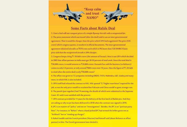 রাফাল নিয়ে ৯টা পয়েন্ট উল্লেখ করা হয়েছে ওই কার্ডে। যা শুরু হচ্ছে ‘একজন বোকাও সাধারণ এয়ারক্র্যাফ্টের সঙ্গে রাফাল যুদ্ধবিমানের তুলনা করবেন না’ এই পয়েন্ট দিয়ে। আর শেষ অর্থাৎ ৯ নম্বর পয়েন্টে উল্লেখ করা হয়েছে, ‘রাহুল গাঁধী ফ্রান্সের প্রেসিডেন্টের প্রসঙ্গ টেনে এনে রাফাল বিতর্ক উস্কে দিতে চেয়েছিলেন। কিন্তু পরবর্তীকালে তাঁর সমস্ত অভিযোগ ফ্রান্সের প্রেসিডেন্ট নিজ মুখে অস্বীকার করেছেন’। রাফাল নিয়ে বিরোধীদের সমস্ত অভিযোগ এবং অভিযোগের বিপক্ষে পাল্টা যুক্তি দিয়ে সাজিয়েছে মাঝের পয়েন্টগুলো।