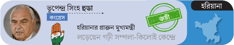 তবে ২০১৪-র বিধানসভা নির্বাচন এবং এ বছর লোকসভা নির্বাচনে গেরুয়া ঝড়ের সামনে মুখ থুবড়ে পড়েও, হরিয়ানায় কংগ্রেস যে ভাবে ঘুরে দাঁড়িয়েছে, রাজ্যের প্রাক্তন মুখ্যমন্ত্রী ভূপেন্দ্র সিংহকেই তার সিংহভাগ কৃতিত্ব দিচ্ছে রাজ্য কংগ্রেসের একাংশ। জমি বণ্টন কেলেঙ্কারিতে নাম জড়ানোয় এখনও পর্যন্ত নাস্তানাবুদ হতে হচ্ছে প্রবীণ এই রাজনীতিককে। তাঁর দীর্ঘ অভিজ্ঞতায় ভর করেই, বিজেপিকে কোণঠাসা করে দেওয়া গিয়েছে বলে মনে করছেন রাজনৈতিক বিশেষজ্ঞরাও।