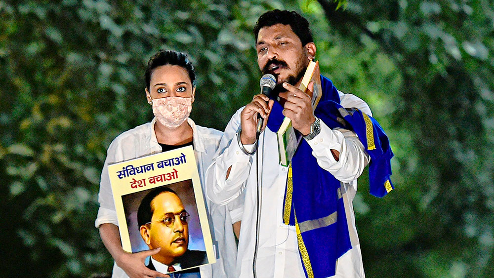 যন্তর মন্তরে স্বরা ভাস্কর ও চন্দ্রশেখর আজ়াদ। ছবি: পিটিআই।