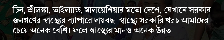 স্বাস্থ্যে সরকারি খরচ বাড়ানো যে কত জরুরি, তা আমাদের আশপাশের কিছু দেশের সঙ্গে তুলনা করলেই স্পষ্ট হবে। চিন (জাতীয় আয়ের ৩.১ শতাংশ), শ্রীলঙ্কা (২ শতাংশ), তাইল্যান্ড (৩.৬ শতাংশ), মালয়েশিয়ার (২.৩ শতাংশ) মতো দেশে, যেখানে সরকার জনগণের স্বাস্থ্যের ব্যাপারে দায়বদ্ধ, স্বাস্থ্যে সরকারি খরচ আমাদের চেয়ে অনেক বেশি। ফলে স্বাস্থ্যের মানও অনেক উন্নত।