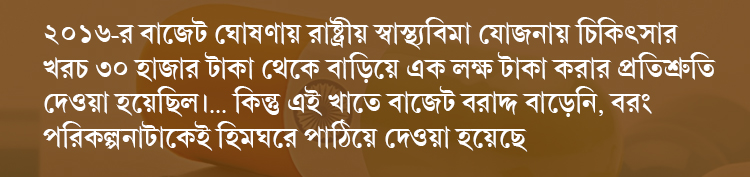 সরকার পরিষেবার জন্য উভয়কেই টাকা দেবে একই হারে। ২০১৬-র বাজেট ঘোষণায় রাষ্ট্রীয় স্বাস্থ্যবিমা যোজনায় (আরএসবিওয়াই) চিকিৎসার খরচ ৩০ হাজার টাকা থেকে বাড়িয়ে এক লক্ষ টাকা করার প্রতিশ্রুতি দেওয়া হয়েছিল। এটা করলে হয়ত সাময়িক কিছু রিলিফ দেওয়া যেত। কিন্তু এই খাতে বাজেট বরাদ্দ বাড়েনি, বরং পরিকল্পনাটাকেই হিমঘরে পাঠিয়ে দেওয়া হয়েছে।