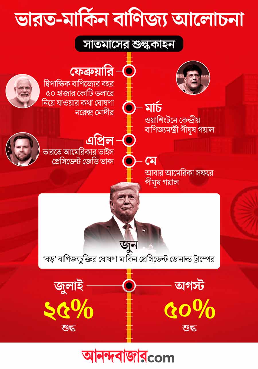 সমাধানসূত্র না-বেরোনোয় দিল্লি ফিরে আসেন ভারতীয় প্রতিনিধিরা। ৪ জুলাই বাণিজ্যমন্ত্রী গয়াল বলেন, সময়সীমার (যে সময় ট্রাম্প বেঁধে দিয়েছিলেন) চাপে ভারত বাণিজ্যচুক্তি করবে না। আগে জাতীয় স্বার্থ মাথায় রাখা হবে। জুলাইয়ের মাঝামাঝি সময়ে আবার আমেরিকা যান ভারতীয় প্রতিনিধিরা। ঘটনাচক্রে, সেই সময়েই সংসদে প্রথম বার ‘অপারেশন সিঁদুর’ এবং ট্রাম্পের মন্তব্য নিয়ে প্রকাশ্যে মুখ খোলেন মোদী। বলেন, কোনও নেতার চাপে ‘অপারেশন সিঁদুর’ বন্ধ হয়নি! দীর্ঘ দিন ধরে ট্রাম্প দাবি করে আসছিলেন, ভারত-পাকিস্তানের মধ্যে সংঘর্ষবিরতির নেপথ্যে তিনিই রয়েছেন। প্রকারান্তরে মার্কিন প্রেসিডেন্টের সেই দাবিও উড়িয়ে দিয়েছিলেন মোদী। এর পর ৩০ জুলাই ভারতীয় পণ্যে ২৫ শতাংশ শুল্ক চাপানোর কথা ঘোষণা করেন ট্রাম্প। হুমকি দেন, ভারত যদি রাশিয়া থেকে তেল কেনা না-থামায়, তা হলে আরও ২৫ শতাংশ শুল্ক চাপানো হবে।