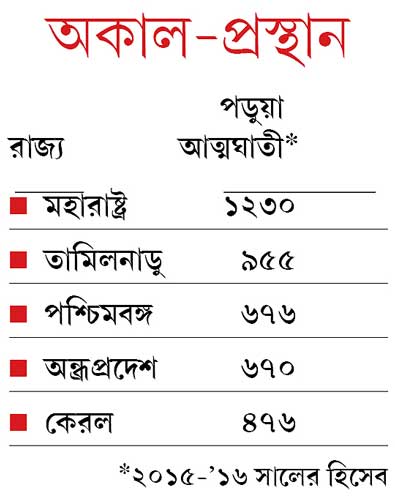 ন্যাশনাল ক্রাইম রেকর্ড ব্যুরো (এনসিআরবি)-র পরিসংখ্যান, পড়ার চাপে আত্মহত্যার প্রবণতায় দেশের মধ্যে পশ্চিমবঙ্গ এখন তৃতীয়। মহারাষ্ট্র ও তামিলনাড়ুর পরেই। গত বছর মহারাষ্ট্রে ১২৩০, তামিলনাড়ুতে ৯৫৫, বাংলায় ৬৭৬ জন পড়ার চাপে আত্মহত্যা করেছে। এই প্রবণতা বেশি একাদশ-দ্বাদশের পড়ুয়াদের মধ্যেই।