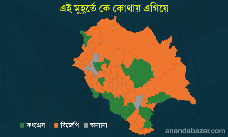 বেলা ১২টা পর্যন্ত যা খবর তাতে, ৪৫টি আসনে এগিয়ে রয়েছে বিজেপি। এর মধ্যে বেশ কয়েকটিতে তাদের জয় এসেছে। কংগ্রেস এগিয়ে রয়েছে মাত্র ১৯টিতে। ফলে এটা স্পষ্ট, দেবভূমিতে এ বার সরকার গঠন করতে চলেছে বিজেপি। যদিও বিজেপি-র মুখ্যমন্ত্রী পদপ্রার্থী প্রেমকুমার ধুমল এখনও পর্যন্ত পিছিয়ে রয়েছেন হামিকপুর কেন্দ্র থেকে।