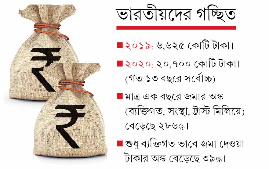 সেই নরেন্দ্র মোদীর জমানায় ভারতীয়দের সুইস ব্যাঙ্কে গচ্ছিত জমা টাকার পরিমাণ সমস্ত রেকর্ড ভেঙে দিল। ২০২০ সালে তা ২০,৭০০ কোটি টাকায় পৌঁছেছে। ১৩ বছরে সর্বোচ্চ। ২০১৮ ও ২০১৯ সালে তুলনায় কিছুটা কম টাকা জমতে দেখা গিয়েছিল। এ বার ২৮৬% বেড়ে গিয়েছে! সুইৎজ়ারল্যান্ডের কেন্দ্রীয় ব্যাঙ্কের পরিসংখ্যান অনুযায়ী, গ্রাহকদের অ্যাকাউন্টে জমা অর্থ কমলেও বন্ড, সিকিউরিটিজ় ও অন্যান্য ভাবে সুইস ব্যাঙ্কে গচ্ছিত অর্থ বিপুল ভাবে বেড়েছে। অন্য ব্যাঙ্কের মাধ্যমে সুইস ব্যাঙ্কে জমা টাকার পরিমাণও বেড়েছে।