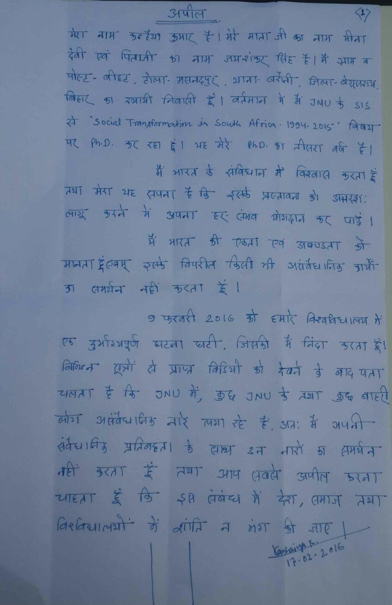 কানহাইয়া কুমারের লিখিত বিবৃতি।