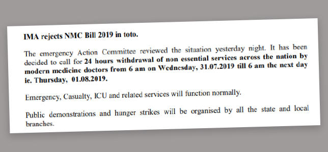 ওই বিলের প্রতিবাদে আইএমএ-র সদস্য ও চিকিৎসকদের একাংশ ওই দিনই বিক্ষোভ দেখান। সোমবার সকালে এইমস থেকে প্রায় পাঁচ হাজার চিকিৎসক ও চিকিৎসাকর্মী মিছিল করলে তাঁদের আটকে দেয় পুলিশ। শ’তিনেক চিকিৎসক গ্রেফতারও হন। মঙ্গলবার আইএমএ-র সর্বভারতীয় সভাপতি তথা রাজ্যসভায় তৃণমূলের সাংসদ শান্তনু সেন বলেন, “এনএমসি বিল জনস্বার্থ বিরোধী। চিকিৎসা পরিষেবাটা কেন্দ্র কর্পোরেটদের হাতে তুলে দিচ্ছে। আমরা এর বিরুদ্ধে রাস্তায় নেমে প্রতিবাদ করছি। আগামী কাল দেশ জুড়ে ২৪ ঘণ্টা ধর্মঘট ডাকা হয়েছে। তবে জরুরি পরিষেবাকে ধর্মঘটের আওতার বাইরে রাখা হয়েছে।”