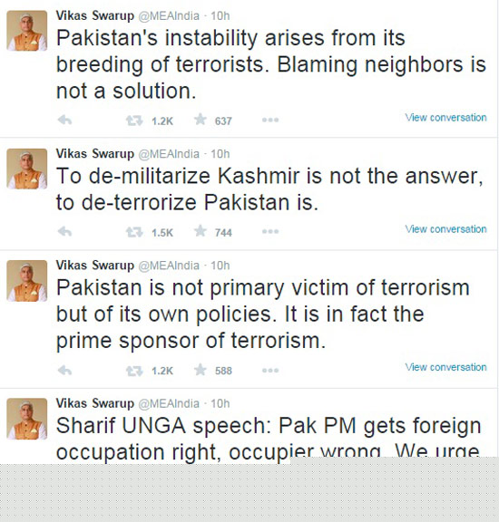 কাশ্মীর সমস্যার সমাধানে নওয়াজ শরিফের বাতলে দেওয়া ‘চার পয়েন্ট’ ফর্মুলার উত্তরেই পাকিস্তানকে এক হাত নিয়েছে ভারত। সন্ত্রাসের পীঠস্থান বলে পাকিস্তানকে আক্রমণ করে গত কালই টুইট করেন বিদেশমন্ত্রকের মুখপাত্র বিকাশ স্বরূপ। চার দফা প্রস্তাবের মধ্যে নিঃশর্ত ভাবে কাশ্মীর এবং সিযাচেন থেকে সেনা প্রত্যাহার এবং ২০০৩ সালের সংঘর্ষবিরতি চুক্তি মেনে চলার কথা বলেছেন নওয়াজ। ভারতের কড়া জবাব, সেনা প্রত্যাহার নয়, বরং কাশ্মীরে শান্তি ফেরাতে জঙ্গিদের হঠাতে মন দিক পাকিস্তান। পাকিস্তানকে সন্ত্রাসের বলি বলে আখ্যা দিয়েছিলেন নওয়াজ। তারও জবাব বেশ কড়া ভাবেই দিয়েছে ভারত। বিদেশমন্ত্রকের মুখপাত্র বিকাশ স্বরূপ এ দিন টুইট করে বলেন, ‘‘পাকিস্তান সন্ত্রাসের বলি নয়, সন্ত্রাসের পীঠস্থান। সন্ত্রাসবাদীদের যাবতীয় প্রয়োজনীয় যোগান দেয় তারা।’’ কাশ্মীরের সঙ্গে প্যালেস্তাইনের তুলনা করে নওয়াজ বলেছিলেন, “বিদেশি শক্তির হাতে লাঞ্ছিত হচ্ছেন ওই এলাকার মানুষ।” পাল্টা টুইটে বিকাশের দাবি, “বিদেশি শক্তির কথা বলে নওয়াজ ঠিকই বলেছেন। আর তাঁর সেই সূত্রেই পাক অধিকৃত কাশ্মীর থেকে ‘বিদেশি’ পাকিস্তানের অবিলম্বে সরে যাওয়া উচিত।”