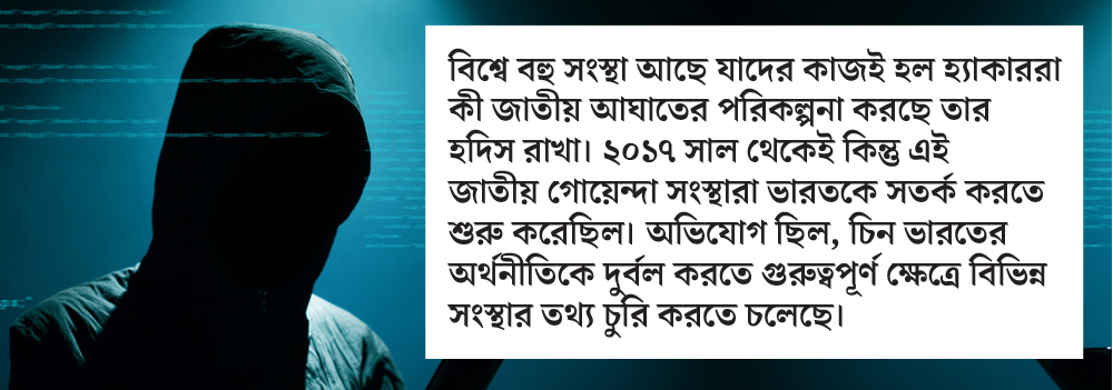 বিশ্বে বহু সংস্থা আছে যাদের কাজই হল হ্যাকাররা কী জাতীয় আঘাতের পরিকল্পনা করছে তার হদিস রাখা। ২০১৭ সাল থেকেই কিন্তু এই জাতীয় গোয়েন্দা সংস্থারা ভারতকে সতর্ক করতে শুরু করেছিল। অভিযোগ ছিল, চিন ভারতের অর্থনীতিকে দুর্বল করতে গুরুত্বপূর্ণ ক্ষেত্রে বিভিন্ন সংস্থার তথ্য চুরি করতে চলেছে। ২০১৩ সালে আরপিজি লাইফসায়েন্সের আড়াই কোটি টাকা ইয়েস ব্যাঙ্ক থেকে মেরে দিয়েছিল। তাই নিয়ে দুই পক্ষের মধ্যে নানান চাপানউতোর চললেও, এর মধ্যেও চিনের হাত দেখেছিল অনেকেই। এর ফলে যেটা হয়েছিল তা হল, ইয়েস ব্যাঙ্কের উপর আপনার আমার আস্থা নড়ে গিয়েছিল। আর চিন কিন্তু সেটাই চায়।