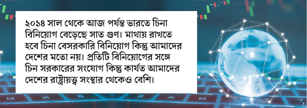 একটা তথ্য এই প্রসঙ্গে একটু দেখে নেওয়া জরুরি। ২০১৪ সাল থেকে আজ পর্যন্ত ভারতে চিনা বিনিয়োগ বেড়েছে সাত গুণ। মাথায় রাখতে হবে চিনা বেসরকারি বিনিয়োগ কিন্তু আমাদের দেশের মতো নয়। প্রতিটি বিনিয়োগের সঙ্গে চিন সরকারের সংযোগ কিন্তু কার্যত আমাদের দেশের রাষ্ট্রায়ত্ত্ব সংস্থার থেকেও বেশি। আর আমরা কিন্তু জেনেশুনেই চিনা বিনিয়োগ অকাতরে টেনে এনেছি। আমাদের গণতান্ত্রিক পরিকাঠামোর প্রেক্ষিতে কী করা যেত বা যেত না, সেটা অন্য প্রশ্ন। আমরা চিনের আগ্রাসী মনোভাব জেনেও কিন্তু এগিয়ে গিয়েছি সাবধান না হয়েই। যা করোনাকালে মাস্ক ব্যবহার না করারই সমতুল্য। আজ কিন্তু আমাদের অর্থনীতির প্রেক্ষিতে চিনের গুরুত্ব অপরিসীম। সে ওষুধের ব্যবসাতেই হোক, বা রসায়নে। গাড়ির যন্ত্রাংশে বা খেলনায়।