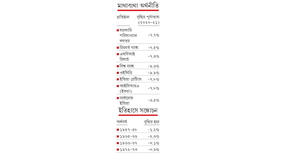 এর আগে রিজার্ভ ব্যাঙ্কের পূর্বাভাস ছিল, কোভিড ও লকডাউনের ধাক্কায় বৃদ্ধির হার নেমে যাবে শূন্যের ৭.৫% নীচে। এ দিন স্পষ্ট, তার থেকেও বেশি সঙ্কোচনের আশঙ্কা করছে কেন্দ্র। তা-ও এটি প্রথম আগাম অনুমান। পরিসংখ্যান দফতর জানিয়েছে, কোভিডে তথ্য সংগ্রহে সমস্যা হয়েছে। তাই পরে পূর্বাভাস সংশোধিত হতে পারে। অর্থনীতিবিদদের একাংশের ধারণা, সঙ্কোচন আরও বেশি হবে। বিশ্ব ব্যাঙ্কের ধারণা, তা হবে ৯.৬%।