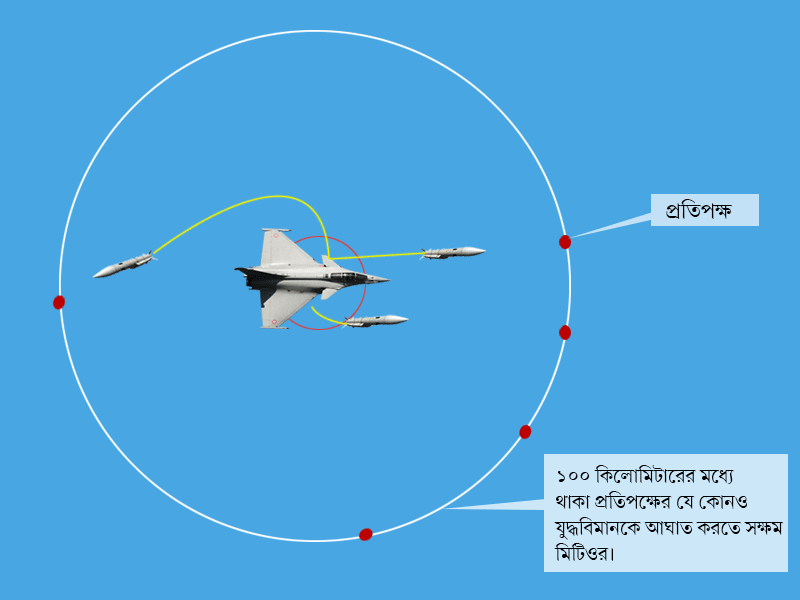 ৫৮ হাজার কোটি টাকা খরচ করে ভারত যে শুধু ৩৬টি যুদ্ধবিমান পাচ্ছে তা কিন্তু নয়। আনুসঙ্গিক অস্ত্রশস্ত্রও ভারত ফ্রান্সের কাছ থেকে পাচ্ছে। সেই সব অস্ত্রশস্ত্রের মধ্যে রয়েছে মিটিওর ক্ষেপণাস্ত্র। পৃথিবীতে যত রকমের আকাশ-থেকে-আকাশ ক্ষেপণাস্ত্র রয়েছে, সেগুলির মধ্যে এই মিটিওর ক্ষেপণাস্ত্রকে অন্যতম সেরা হিসেবে ধরা হয়। শব্দের বেগের চেয়ে চার গুণ জোরে ছোটে এই ক্ষেপণাস্ত্র। রাফাল যুদ্ধবিমান এই ক্ষেপণাস্ত্র ছুড়ে আকাশে ১০০ কিলোমিটারেরও বেশি দূরে থাকা শত্রু বিমানকে ধ্বংস করে দিতে পারে।
