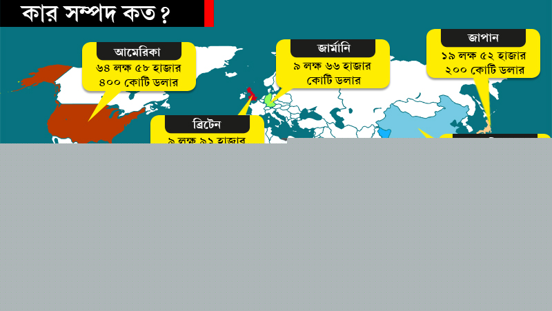 রিপোর্ট বলছে, প্রথম স্থানে থাকা আমেরিকার মোট সম্পদের পরিমাণ ৬৪ লক্ষ ৫৮ হাজার ৪০০ কোটি ডলার। দ্বিতীয় স্থানে রয়েছে চিন। তাদের মোট সম্পদ ২৪ লক্ষ ৮০ হাজার ৩০০ কোটি ডলার। আর ১৯ লক্ষ ৫২ হাজার ২০০ কোটি ডলার নিয়ে তৃতীয় স্থানে জাপান।