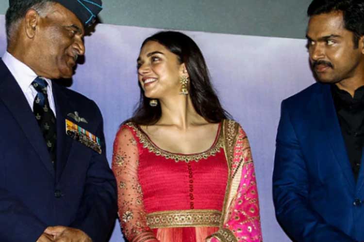 ফিল্মের নায়ক কার্তি ও অভিনেত্রী অদিতি রাও হায়দারির সঙ্গে অভিনন্দনের বাবা অবসরপ্রাপ্ত এয়ার মার্শাল সিমহাকুট্টি বর্তমান (বাঁ দিকে)