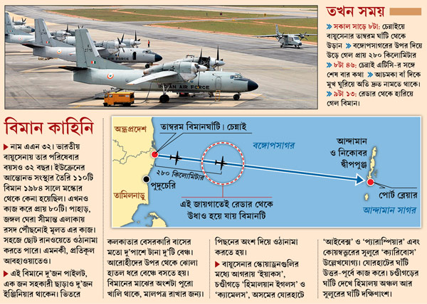 বঙ্গোপসাগরের আকাশ থেকে হারিয়ে গেল ভারতীয় বায়ুসেনার বিমান। দুই পাইলট-সহ মোট ২৯ জন যাত্রী ছিলেন বিমানটিতে। তাঁদের কেউ বায়ুসেনা, কেউ সেনাবাহিনী, কেউ নৌবাহিনী, কেউ উপকূলরক্ষী বাহিনীর অফিসার। ছিলেন সেনা-আত্মীয় অসামরিক ব্যক্তিও।