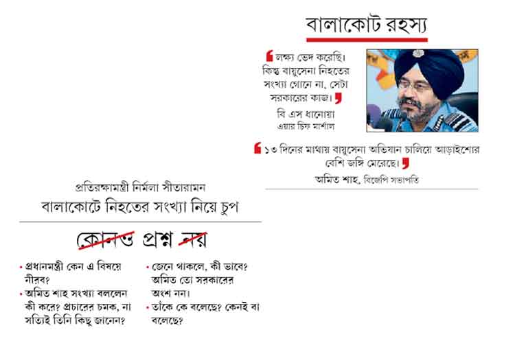 গত কালই গুজরাতে গিয়ে অমিত শাহ ঘোষণা করলেন, বায়ুসেনার অভিযানে মারা গিয়েছে আড়াইশোর বেশি জঙ্গি। এই বিবৃতির চব্বিশ ঘণ্টা পরেও সরকারের তরফে কেউ জানাননি, সংখ্যাটি ঠিক না ভুল। আজ বায়ুসেনা প্রধান বি এস ধানোয়া শুধু বলেছেন, তাঁরা লক্ষ্যভেদ করেছেন। কত জঙ্গি নিহত হয়েছে? জবাবে বায়ুসেনা প্রধান জানান, সেটা গোনা তাঁদের কাজ নয়, সরকারের কাজ।