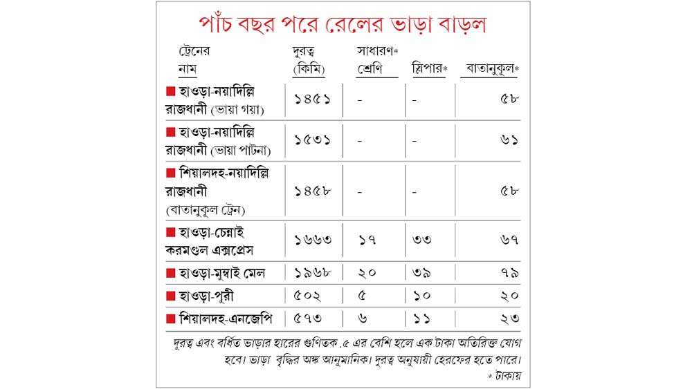 কয়েক দিন ধরেই ভাড়া বাড়ানোর ব্যাপারে ইঙ্গিত দিচ্ছিল রেল মন্ত্রক। অর্থনীতি ঝিমিয়ে পড়ার পর থেকে রেলের পণ্য পরিবহণে ভাটার টান। মূলত ওই খাতের আয় থেকে দেওয়া ভর্তুকিই এত দিন যাত্রী-ভাড়ায় হাত পড়তে দেয়নি। ওয়াকিবহাল মহলের মতে, বর্তমানে পণ্য ও যাত্রী-ভাড়া বাবদ আয় কমতে থাকা এবং সপ্তম বেতন কমিশনের চাপেই ভাড়া বৃদ্ধির সিদ্ধান্ত নিতে হল। আজ প্রধানমন্ত্রীর সচিবালয় সবুজ সঙ্কেত দিতেই ভাড়া বৃদ্ধির কথা ঘোষণা করে রেল। তবে মন্ত্রকের দাবি, ভাড়া সামান্যই বেড়েছে। সর্ব্বোচ্চ ভাড়া বাড়ানো হয়েছে এসি শ্রেণিতে। প্রতি কিলোমিটারে ৪ পয়সা। অর্থাৎ দিল্লি-কলকাতা রাজধানী বা পূর্বা এক্সপ্রেসের মতো ট্রেনগুলিতে এসি শ্রেণি-পিছু ৬০-৬৫ টাকার মতো ভাড়া বাড়ছে। রেলের দাবি, এতে যাত্রীদের পকেটে টান পড়ার কথা নয়। স্লিপার শ্রেণিতে ভাড়া বৃদ্ধি হয়েছে প্রতি কিলোমিটারে ২ পয়সা। প্যাসেঞ্জার ট্রেনগুলিতে ভাড়া বাড়ছে কিলোমিটার প্রতি ১ পয়সা। লোকাল ট্রেনের ভাড়া অপরিবর্তিত।