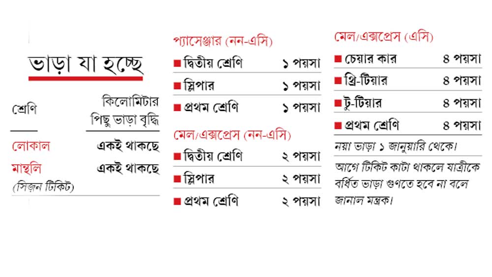 নতুন বছরের প্রথম দিন থেকেই ভাড়া বাড়ছে রেলে। তবে আমজনতার কথা মাথায় রেখে ভাড়া বাড়ানোর সিদ্ধান্ত হয়েছে মূলত দূরপাল্লার ট্রেনে। বাতানুকূল কামরার সব শ্রেণিতেই গড় ভাড়া বাড়ছে কিলোমিটার পিছু ৪ পয়সা হারে। আজ বছরের শেষ সন্ধ্যায় রেল মন্ত্রক জানিয়েছে, আগামিকাল থেকে যাঁরা টিকিট কাটবেন তাঁদের ওই বর্ধিত ভাড়া গুনতে হবে। যাঁরা অগ্রিম টিকিট কেটে রেখেছেন তাঁরা পুরনো ভাড়াতেই যাত্রা করতে পারবেন। শহর ও শহরতলির লোকাল ট্রেনের ভাড়া এবং মান্থলি টিকিটের দাম একই থাকছে।