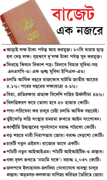 মূল্যবৃদ্ধির জ্বালায় জর্জরিত মধ্যবিত্তকে সুরাহা দিতে জেটলি আয়করে ছাড়ের ঊর্ধ্বসীমা বাড়িয়ে দিয়েছেন। তাতে করদাতাদের হাতে নগদ টাকা বেশি থাকবে। কিন্তু রাজকোষের ২২ হাজার কোটি টাকা ক্ষতি হবে। অন্য দিকে, পরোক্ষ করের ক্ষেত্রে সিগারেট, চুরুট, পানমশলা, গুটখায় আরও কর চাপিয়ে এবং পরিষেবা করের পরিধি কিছুটা বাড়িয়েও মাত্র ৭ হাজার ৫২৫ কোটি টাকার বাড়তি আয়ের পথ খুলতেপেরেছেন। যার অর্থ, ১৪ হাজার ৪৭৫ কোটি টাকার রাজস্ব ক্ষতি হচ্ছে। আয়বৃদ্ধির আর একটি পথ, পণ্য-পরিষেবা কর (জিএসটি) এখনও রাজনৈতিক জটিলতায় আটকে। যদিও জেটলির আশা, চলতি আর্থিক বছরের মধ্যে আদর্শ না হোক একটা ভাল জিএসটি ব্যবস্থা তিনি চালু করতে পারবেন।