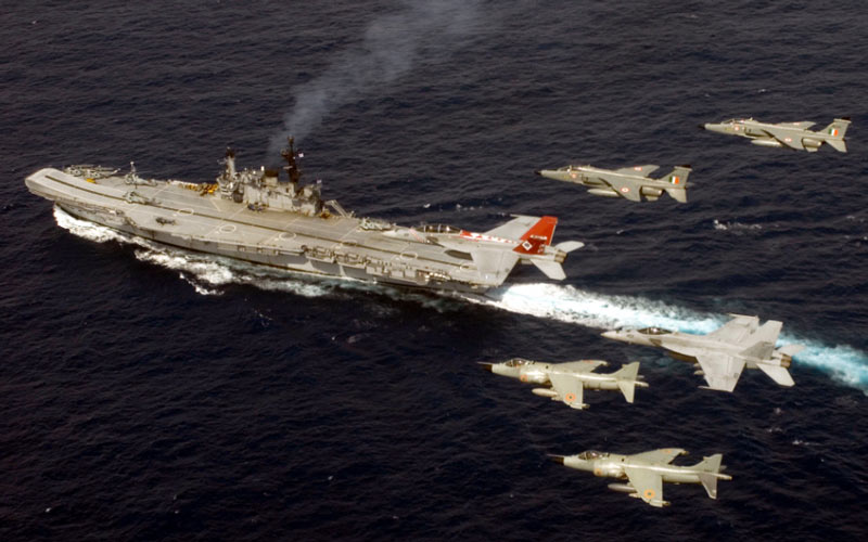 ভারত-মার্কিন নৌ-মহড়ায় আইএনএস বিরাটের ডেক থেকে আকাশে ওড়া সি হ্যারিয়ার জেটগুলি পাল্লা দিচ্ছে মার্কিন যুদ্ধবিমানের সঙ্গে। নীচে আইএনএস বিরাট। ছবি: সংগৃহীত।