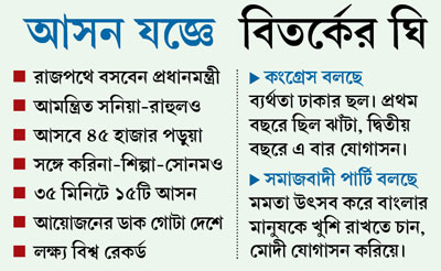 সরকারি সূত্রের খবর, দেশ বিদেশের টিভি ও ইন্টারনেটে যাতে ওই অনুষ্ঠান সরাসরি দেখা যায়, আটঘাট বাঁধা হচ্ছে সে ব্যাপারেও। বেসরকারি মিডিয়া সংস্থাগুলির সঙ্গেও আলোচনা করছেন তথ্যসচিব বিমল জুলকা।