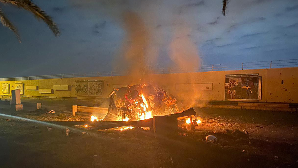 বাগদাদ বিমানবন্দরের কাছে মার্কিন ড্রোন হানার পর জ্বলছে সোলেমানির গাড়ি। শুক্রবার। ছবি- রয়টার্স