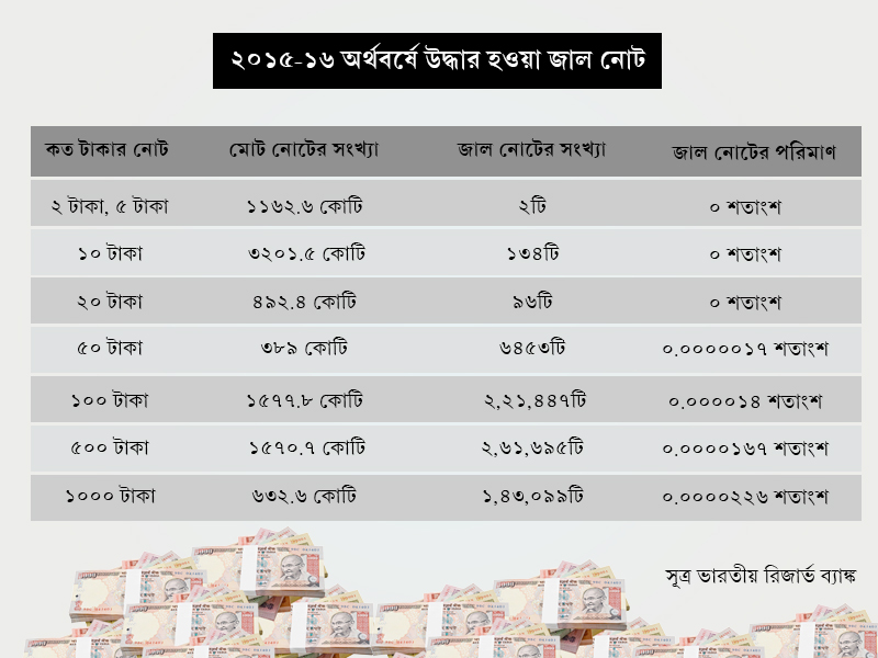 চলতি মাসের গোড়ায় জাতির উদ্দেশ্যে ভাষণে ৫০০ এবং হাজারের নোট বাতিল ঘোষণা করেছেন প্রধানমন্ত্রী। বাজারে চলা নোটের সিংহ ভাগ (প্রায় ৮৬ শতাংশ) ছিল ৫০০ আর হাজারের দখলে। নোট জাল করতে সিদ্ধহস্তদের প্রভাব তখন এতটাই প্রবল যে, আসল আর নকল নোট আলাদা করাই দুষ্কর। সাধারণ মানুষ তো বটেই, নোট চিনতে যে দুঁদে ব্যাঙ্ক কর্মীরাও নাজেহাল, একটি সরকারি তথ্যই তার জন্য যথেষ্ট। সরকারের হিসাব বলছে, প্রতি ২৫০টি জাল নোটের মধ্যে চিহ্নিত হয় মাত্র ১৬টি নোট। তাই বাজার থেকে পুরনো নোট তুলে নিয়ে নতুন নোট আনলে জাল নোটের কারবার থমকে যাবে বলে দাবি করেছিল কেন্দ্র। নতুন নোট জাল করা কার্যত অসম্ভব বলেও ঠারেঠোরে জানিয়েছিল কেন্দ্র। প্রথমে শোনা গিয়েছিল নতুন ২০০০-এর নোটে রয়েছে মাইক্রোচিপ। জাল নোট এবং কালো টাকা আটকাতে যা মিরাকলের মতোই কাজ করবে। পরে অবশ্য সরকার এই চিপের অস্তিত্ব অস্বীকার করে। নোট বাতিল অধ্যায়ের আগে পর্যন্ত বাজারে চালু ছিল প্রায় ন’হাজার কোটি নোট। রিজার্ভ ব্যাঙ্কের তথ্য অনুযায়ী, এর মধ্যে ছ’লক্ষ ৩০ হাজার অর্থাৎ ০.০০০৭ শতাংশ জাল নোট। অর্থাত্ প্রতি ১০ লক্ষে জাল নোটের সংখ্যা ৭টি। ২০১৫-১৬ অর্থবর্ষের হিসাব বলছে, বাজারে চালু জাল নোটের মোট অঙ্ক ২৯ কোটি ৬৪ লক্ষ টাকা। দেশে চালু অর্থাঙ্কের যা ০.০০১৮ শতাংশ। তবে সরকারি এই তথ্যে বাজেয়াপ্ত হওয়া টাকার হিসাব নেই। তা বাজেয়াপ্ত হওয়া অর্থের পরিমাণ ঠিক কত? গত সপ্তাহে লোকসভায় পেশ হওয়া ন্যশনাল ক্রাইম রেকর্ডস ব্যুরোর রিপোর্ট অনুযায়ী, ২০১৫ সালে দেশে বাজেয়াপ্ত হয়েছে ৪৩ কোটি ৮০ লক্ষ টাকার জাল নোট। চলতি বছর সেপ্টেম্বর পর্যন্ত বাজেয়াপ্ত হয়েছে আরও প্রায় ২৮ কোটি। অর্থাৎ সব মিলিয়ে জাল টাকার পরিমাণ কোনও ভাবেই ১০০ কোটির বেশি নয়।