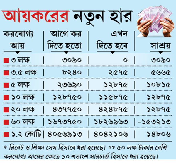 এত দিন আড়াই লক্ষ টাকা থেকে ৫ লক্ষ টাকা পর্যন্ত করযোগ্য আয়ের উপরে ১০ শতাংশ হারে কর দিতে হতো। অর্থমন্ত্রী এ দিন ঘোষণা করেন, সেই হার কমিয়ে এ বার করা হবে ৫ শতাংশ। এবং তিনি জানান, এর ফলে ‘‘যাঁদের করযোগ্য আয় আড়াই থেকে ৫ লক্ষ টাকার মধ্যে তাঁদের কর বাবদ বোঝা হয় শূন্য হয়ে যাবে বা বর্তমান দায়ের অর্ধেক হবে।’’