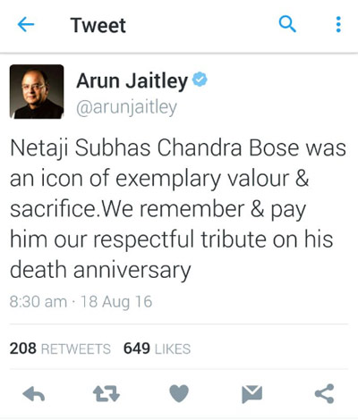 নেতাজি সুভাষচন্দ্র বসুর প্রতি অরুণ জেটলির শ্রদ্ধাজ্ঞাপন ঘিরে তীব্র বিতর্ক ছড়াল গোটা দেশে। টুইটারে বৃহস্পতিবার কেন্দ্রীয় অর্থমন্ত্রী যা লিখলেন, তা যদি ভারত সরকারের অবস্থান হয়, তা হলে বিমান দুর্ঘটনায় নেতাজির মৃত্যু হওয়ার তত্ত্বে সিলমোহর দিয়ে দিল বিজেপি তথা এনডিএ সরকারও। জেটলির টুইট দেখেই তার বিরোধিতায় সরব হয়েছেন পশ্চিমবঙ্গের মুখ্যমন্ত্রী মমতা বন্দ্যোপাধ্যায়। টুইটারে জেটলির বিরুদ্ধে স্পষ্ট অসন্তোষ ব্যক্ত করেছেন তিনি।