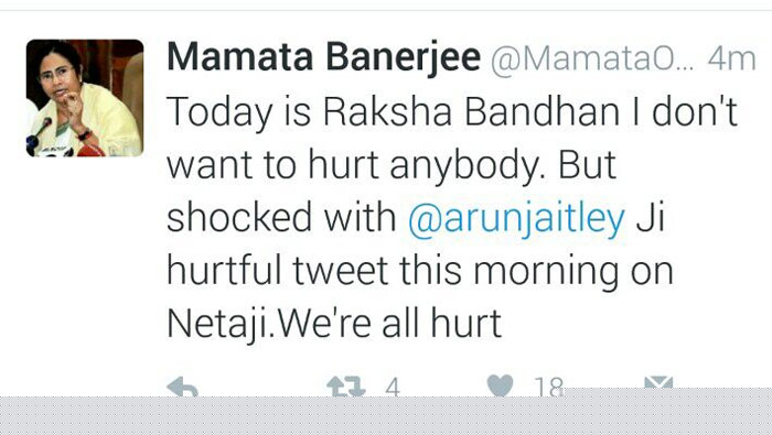 এই টুইটে স্পষ্ট যে অরুণ জেটলি বিমান দুর্ঘটনায় নেতাজির মৃত্যুর তত্ত্বে পূর্ণ বিশ্বাস রাখছেন। জেটলির এই অবস্থান কি মোদী সরকারেরই অবস্থান? জোর জল্পনা শুরু হয়ে গিয়েছে বিভিন্ন মহলে। পশ্চিমবঙ্গের মুখ্যমন্ত্রী কিন্তু জেটলির এই টুইটের ঘোর বিরোধিতা করেছেন। পাল্টা টুইটে মমতা বন্দ্যোপাধ্যায় লিখেছেন, ‘‘আজ রাখি বন্ধন। আমি কারওকে আঘাত করতে চাই না। কিন্তু আজ সকালে অরুণ জেটলির যন্ত্রণাদায়ক টুইট দেখে স্তম্ভিত। আমরা সবাই মর্মাহত।’’