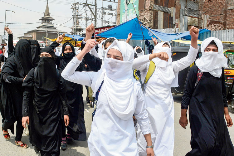 বিক্ষোভ: বান্দিপোরায় শিশু ধর্ষণের ঘটনার প্রতিবাদে শামিল শ্রীনগরের স্কুলছাত্রীরা। বুধবার। ছবি: পিটিআই।