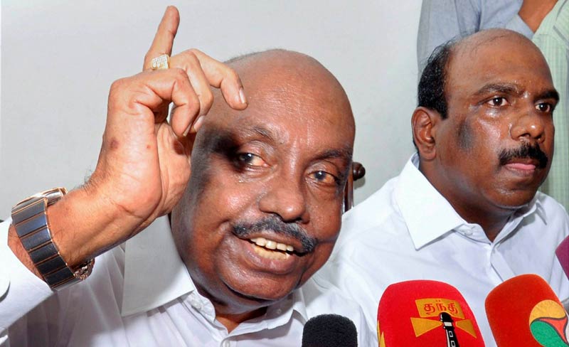 বিস্ফোরক অভিযোগ এনে শশিকলার ভূমিকা খতিয়ে দেখার দাবি তুললেন এআইএডিএমকে-র অন্যতম প্রতিষ্ঠাতা পিএইচ পান্ডিয়ন। সঙ্গে পুত্র মনোজ পান্ডিয়ন। ছবি: পিটিআই।