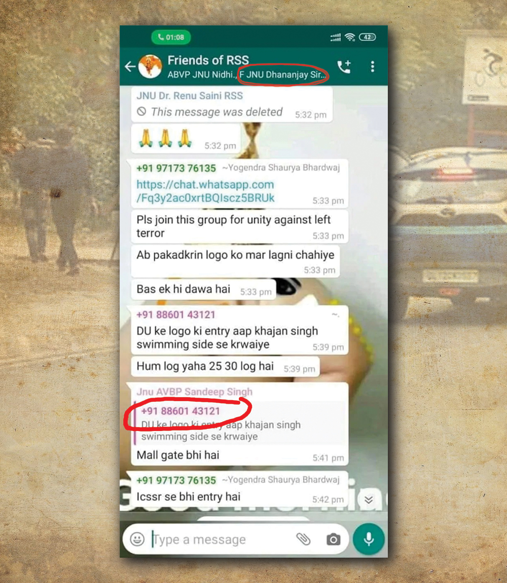 হামলার সময় এবিভিপি ঘনিষ্ঠ কিছু অধ্যাপক তাণ্ডবকারীদের লোক চিনিয়ে দিচ্ছিলেন বলে এর আগে অভিযোগ তুলেছিলেন নিগৃহীত পড়ুয়ারা। এখনও পর্যন্ত তাঁদের অভিযোগ প্রমাণিত না হলেও, এবিভিপি-র কথোপকথনের যে স্ক্রিনশট সামনে এসেছে, তাতে ধনঞ্জয় স্যরক নামের একজনকে ওই গ্রুপে শামিল থাকতে দেখা গিয়েছে। তিনি ক্যাম্পাস চত্বরে আইন-শৃঙ্খলা রক্ষা দায়িত্বে থাকা চিফ প্রোক্টর ধনঞ্জয় সিংহ বলে সোশ্যাল মিডিয়ায় কেউ কেউ দাবি করছেন।