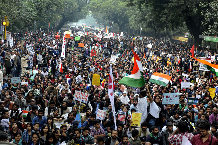 ২০১৬-তে কানহাইয়া কুমারের মুক্তির দাবিতে দিল্লির রাস্তায় বিক্ষোভ মিছিল। —ফাইল চিত্র।