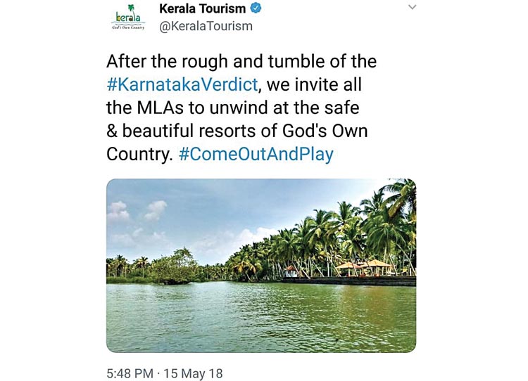 মওকা বুঝে ব্যবসা বাড়াতে কালই মাঠে নেমে পড়ে কেরল পর্যটন। তারা রীতিমতো টুইট করে বলে, ‘‘কর্নাটকের হাড্ডাহাড্ডি লড়াইয়ের শেষে আমরা সমস্ত বিধায়ককে অবসর বিনোদনের জন্য ঈশ্বরের আপন দেশে (কেরল) নিরাপদ ও সুন্দর রিসর্টে আসার আমন্ত্রণ জানাচ্ছি।’’ পরে মুছে দেওয়া হলেও ওইটুকু সময়ের মধ্যেই টুইটটি সাম্প্রতিক সময়ের অন্যতম সেরা বিজ্ঞাপন হিসেবে অ্যাখ্যা পেয়ে যায় নেটিজেনদের কাছে।