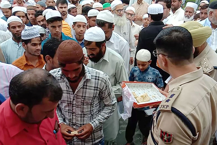 ইদে মিষ্টি বিলি জম্মু-কাশ্মীর পুলিশের। ছবি: এপি।