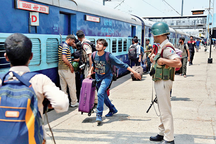 উৎকণ্ঠা: শ্রীনগর ছাড়ছেন এনআইটি পড়ুয়ারা। রবিবার জম্মু স্টেশনে ট্রেন ধরার তাড়া। ছবি: এপি।