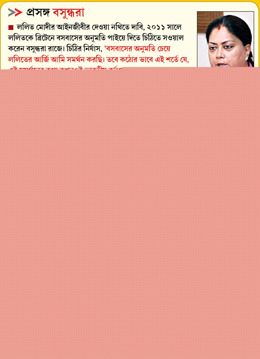 ললিত মোদীর আইনজীবী মেহমুদ আবদির পক্ষ থেকে সংবাদমাধ্যমে পাঠানো এক নথিতে দাবি করা হয়েছে, ললিতকে যাতে ব্রিটেন অভিবাসন দেয় সে জন্য ২০১১ সালে তাঁর হয়ে সওয়াল করেছিলেন বসুন্ধরা। তিন পাতার ওই নথিতে লেখা হয়েছে, ‘ললিত মোদীর দায়ের করা অভিবাসন আবেদনকে আমি সমর্থন করছি। তবে কঠোর ভাবে এই শর্তে যে, আমার এই সমর্থনের কথা কোনও ভাবেই ভারতীয় কর্তৃপক্ষের গোচরে আসবে না।’